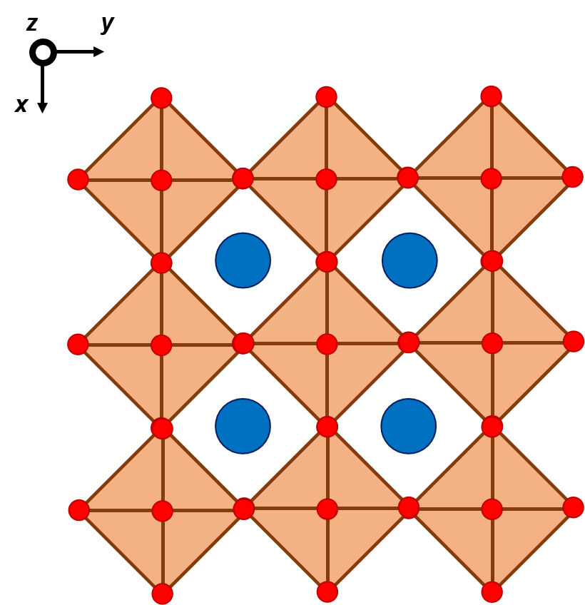 The ideal perovskite structure is sketched in the left side, as seen from above. This structure can distort if the atoms in blue are not sufficient large. In the right side you find a distorted perovskite structure. The way the perovskite structure mainly distorts is by rotation around the octahedral axes.