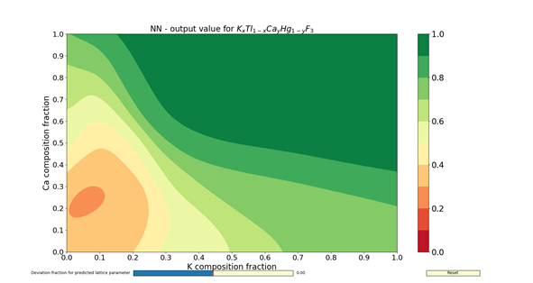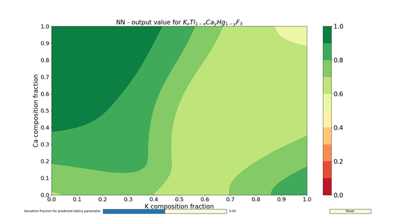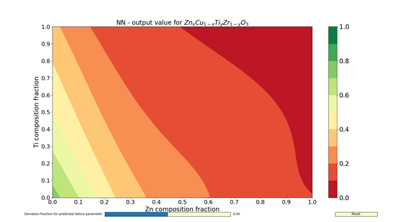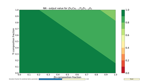 The figures 1 – 4 show the colormaps of the simulated compounds ZnxCu1-xTiyZr1-yO3 and KxTl1-xCayHg1-yO3. These compounds were simulated assuming the ideal perovskite structure (cubic symmetry). The elements in the formula with an x in the subindex shared the same site. The same can be said for those having the subindex y. In fact, the elements with the subindex x shared the cubeoctahedral site, whereas those with y shared the octahedral site. The colormaps of the figures 1 and 3 were computed with the ANN of type A. Similarly, the colormaps of the figures 2 and 4 were computed with the ANN of type C. All colormaps were computed using a step size of Δx = Δy = 0.01. Then, there are 10,201 different compositions in each colormap. The greener the composition, the larger the probability to adopt the perovskite structure. The lattice parameter was calculated as the sum of the atomic radii of the octahedral atom with the atom in vertex (oxygen). The used atomic radii were those reported by Rahm, Ashcroft and Hoffmann in 2016.